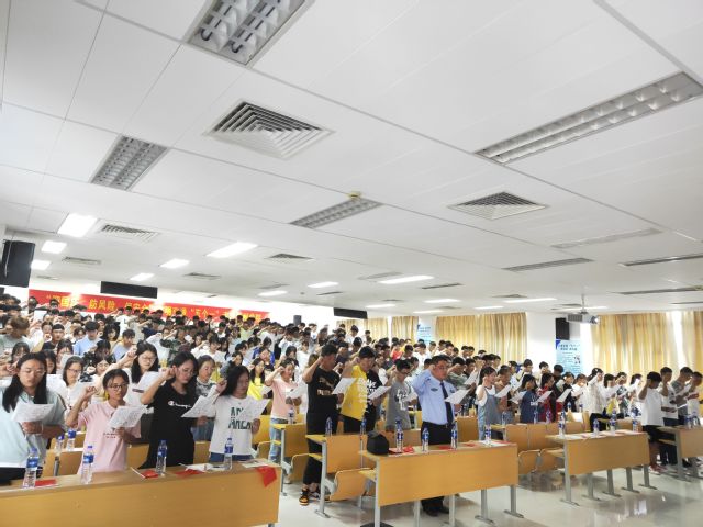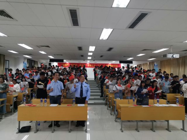 全体2019级新生集体宣誓,严格遵守交通法规,学习掌握交通安全知识,增强交通安全意识,提高安全法制观念,提升交通安全自我保护能力,主动为文明交通安全代言。