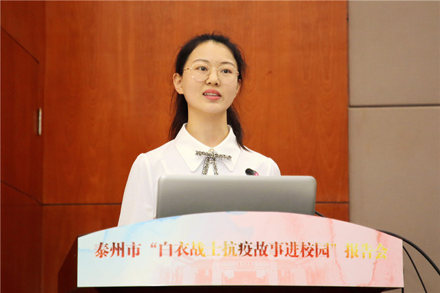来自泰州市援湖北医疗队的4名队员向老员工们宣讲了他们在湖北的抗疫故事。泰州市人民医院援湖北医疗队是泰州市最早出征、最晚归来的一支医疗队,也是唯一的一支专业护理队伍,他们由10名女护士和5名男护士组成,15人中年龄最大的34岁,最小的仅26岁。他们在湖北抗疫71天,转战了两家医院,取得了患者零死亡、医务人员零感染的好成绩,出色地完成了援助任务。宣讲人李瑗动情地讲述泰州市人民医院援湖北医疗队的感人故事。泰州市第三批援湖北医疗队队员、兴化市人民医院主管护师曹蕴娇讲述了她所在团队护士张颖的故事。张颖和男朋友王开迪原准备春节正月初六举办婚礼,请柬都已经发出,因为抗疫工作的需要,张颖主动请战上一线,和男朋友王开迪商定推迟了婚礼,千里驰援湖北黄石,在湖北共战“疫”39天。援湖北医疗队队员杨芳讲述了泰州市中医院援湖北医疗队发挥中医特长,组成中医医疗小分队、中医护理小组,对方舱内病人实施中医中药辨证治疗,队员们还教会患者打中华五禽戏、八段锦,把中医技艺传播到异地他乡,让岐黄之光,照亮方舱。泰州市第二批援湖北医疗队队员、泰州市姜堰中医院护理部主任丁雅琴讲述了自己及15名援湖北医疗队友“逆行而上”的壮举,在疫情的面前,他们只有一个名字:那就是白衣战士!那白衣战袍之下跳动着一颗又一颗火热的赤子之心。
