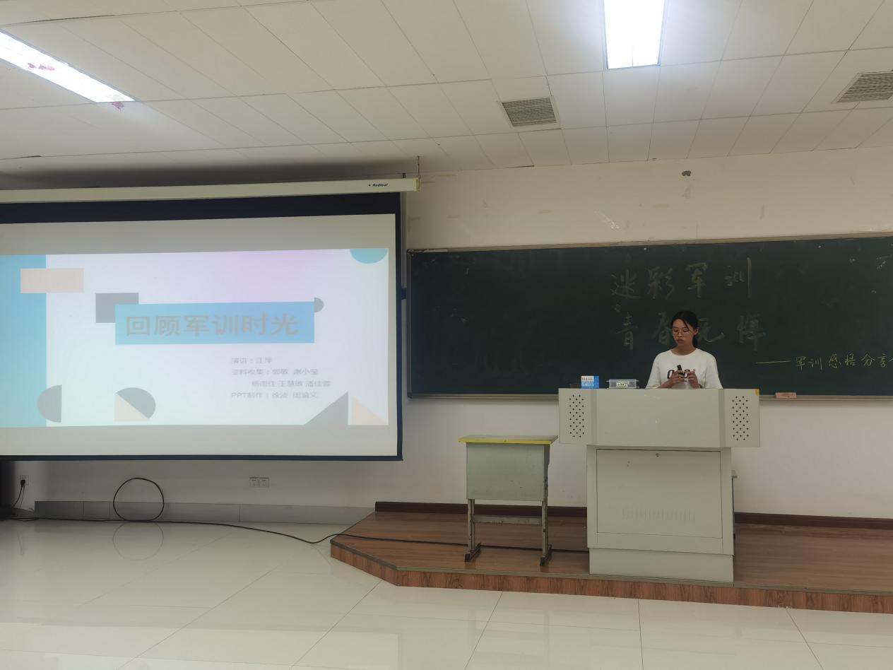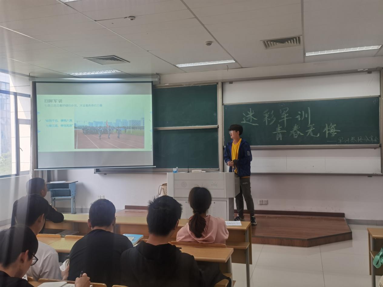 同学们通过一张张照片回顾军训生活,每组都派出代表分享自己小组在军训中的感悟,不同的分享角度,让我们感受到不同的军训。辅导员刘老师给同学们分析了大家在军训前后发生的变化,并希望同学们可以继续保持在军训中养成的良好习惯。