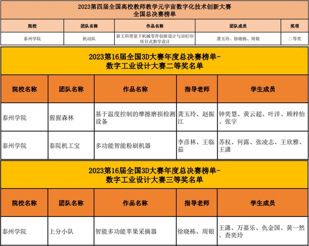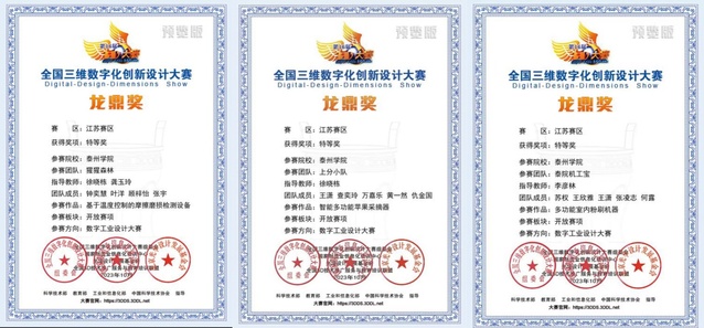 龚玉玲、徐晓栋、周银老师的参赛作品《新工科背景下机械零件创新设计与3D打印项目式教学设计》经过激烈角逐,在2023全国高校教师教学元宇宙数字化技术创新大赛中荣获国家级二等奖。由赵振江、周银、龚玉玲、徐晓栋、李彦林、王临茹等老师指导员工完成的参赛作品,在第16届全国3D大赛省赛中荣获特等奖3项、一等奖3项、二等奖3项、三等奖1项。其中,特等奖作品《基于温度控制的摩擦磨损检测设备》《多功能智能粉刷机机器》《智能多功能苹果采摘器》入围年度总决赛,荣获国家级二等奖2项、三等奖1项。