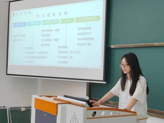 陆瑶以“征途褪寒,前程盎然”为题,从个人情况、考研择校、备考经验三个方面,详细介绍了自己成功上岸211高校的经验。她强调:选择大于努力,自己选择华东理工大学既是机遇更是挑战,研途中的拼搏不仅是专业知识的较量,也是信息资源的博弈;要时刻关注目标院校的招生信息和招考目录,善于利用网络,针对性获取专业课程复习资源,打破信息差和资源壁垒,才能有备无患、事半功倍。最后,陆瑶寄语在场同学:只有专注自我、砥砺奋斗,方能征途褪寒、前程盎然。