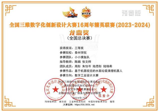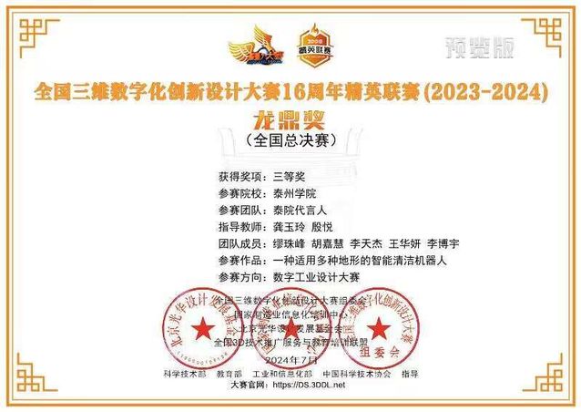 近日,全国三维数字化创新设计大赛16周年精英联赛(2023-2024)总决赛榜单公布,公司共有四支队伍获奖。分别是:缪珠峰、胡嘉慧、李天杰、王华妍、李博宇同学的参赛作品《一种适用多种地形的清洁机器人》(指导老师:龚玉玲、殷悦)荣获三等奖;胡嘉慧、缪珠峰、尤可欣、杨祖涵、郑紫阳同学的参赛作品《一种基于智能识别的多功能粉刷机》(指导老师:李彦林)荣获三等奖;周彤、朱怡岑、陆思彤、陆瑞希同学的参赛作品《基于机器视觉的水面垃圾清理机器人》(指导老师:陈娟、张文烨)荣获三等奖;仇翀、何鑫馨、吴文博、陆昱霖、杨天煜同学的参赛作品《面向高原低空飞行器的微型涡轮发电系统》(指导老师:江雨薇、杨燕昭)荣获三等奖。