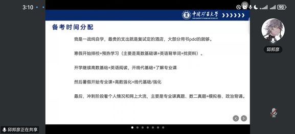 活动伊始,邱邦彦结合自身跨考经历,首先剖析了电气专业跨考的优势与挑战。他以矿大控制学科与电气专业在智能装备、工业自动化等领域的交叉融合为例,鼓励学弟学妹:“跨考并非‘从零开始’,关键是找准本科专业与目标专业的衔接点。”这番贴合实际的分享,既展现了学科间的内在联系,也为有跨考意向的同学打消了顾虑。在备考策略讲解环节,他分享了自己的“上岸秘籍”,并详细解读了目标院校的招生政策、历年报录比及初复试科目特点,尤其针对专业课《自动控制原理》的复习,他强调:“要以教材为核心,结合近10年真题总结高频考点,公式推导要‘知其然更知其所以然’,这是应对计算题的关键。”谈及专业选择时,他结合行业前景与考研数据,对比了电气、控制等相关专业的特点,建议大家“兼顾兴趣与性价比,例如控制工程专硕招生稳定,且与新能源、人工智能等前沿领域结合紧密,是值得关注的方向”。最后,他建议学弟学妹们充分利用目标院校官网的“导师名录”和“学科平台”等模块了解研究方向,优先选择与本科毕设、科研经历相关的导师,提前发送邮件沟通,提高复试优势。