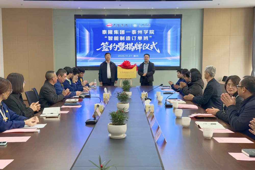 汤艳峰与殷爱国共同为“订单班”揭牌,并强调,此次“订单班”签约是公司推进“三融三促”校地共建的关键实践,更是校企协同育人模式的创新突破。下一步,公司将以“订单班”为载体,进一步深化与泰隆集团在学科与专业建设等方面的长效合作机制,推动教学改革与产业发展同频共振,为区域装备制造产业高质量发展输送更多“用得上、留得住、干得好”的高素质应用型人才。(供稿:江雨薇)