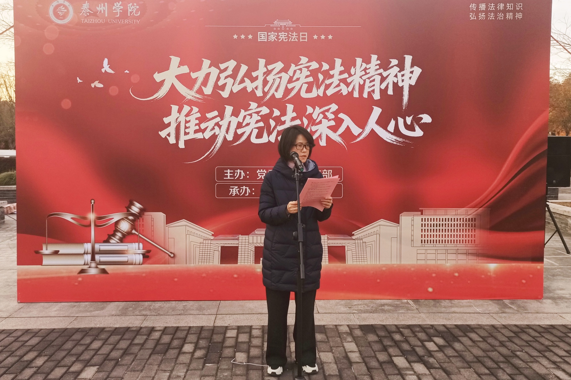 12月4日,由党委员工工作部主办、beats365官方唯一入口承办的“大力弘扬宪法精神,推动宪法深入人心”主题升旗仪式在胡瑗广场举行。机电工程公司党总支书记于晓萍、副书记、副经理董卫华及师生代表100余人参加仪式。